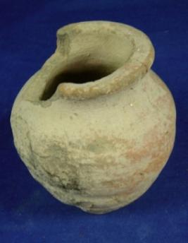| Description / विवरण | Terracotta vessel - pot, ill fired and thick in fabric with broken averted rim, bulbous body and broken circular base. Circular incrustation can be seen on the body |