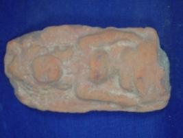 | Description / विवरण | Terracotta figurine of a female in high relief. It is probably a Mother Goddess. The face has incised eyes and rest portions are unidentifiable. There is an elaborate hair style having floral motif in the centre and designs on sides. Two strings of pearl hanging on right side of head. The figurine is bedecked with earrings, necklace and girdle. The right hand is falling straight and left is at the waist. The portion below hip is missing. |