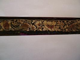 | Description / विवरण | Silk trimming, embroidered, purple ground. Pattern-three green and three red leaves between red flower in white outlines. |