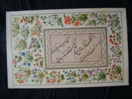 | Description / विवरण | This epithet is written in Brown colour ink. It is written in Persian language and Nastaliq style. It has lining and floral Motifs and a golden and blue border. It deals with praising of god. It is written by Mohammad Amir Baksh in 1251 Hijri. |