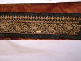 | Description / विवरण | Silk trimming, gold and silk embroidered on black ground. It has elaborate embroidery work in golden thread in floral pattern. |