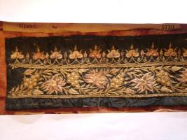| Description / विवरण | Silk trimming, gold and silk embroidered on black ground. It has elaborate embroiderey work in golden thread in floral patten. |