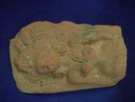 | Description / विवरण | Terracotta female figurine depicting in low relief in standing position. The body below waist is missing. Her both hands are resting on thigh. She has an elaborate head gear where floral designs are visible. The facial features are not clear. The figurine is adorned with jewels like, kundala and necklace. |