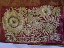 | Description / विवरण | Silk trimming, embroidered red ground. Pattern- yellow leaves and flowers with a peacock and wings. |