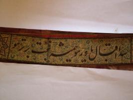 | Description / विवरण | Border of a round cap, an inscription in black Persian letters among green leaves and flowers, embroidered on white ground. |
