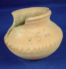 | Description / विवरण | Coarse terracotta vessel - pot having an oval base, bulbous body carinated in centre, the carination has designs of deep incised lines. The mouth is broad with low neck and thick averted rim. |