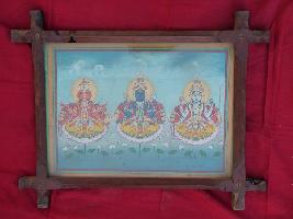 | Description / विवरण | It is a painting of Brahma four face four hands Vishnu four hand , Mahesh four hands . They are shown with their Ayudhyas and all are seated on Lotus, separately. They are all shown on water. It is mounted in a frame. |