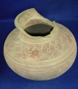 | Description / विवरण | Red polished ware with profuse designs on the upper part with round base, round body and broad mouth. Only small part of the neck is present. The rim is averted and grooved. Just below the neck, oblique cut lines are made around the neck, Next to this, incised geometrical designs are made similar to that of early Mauryan Brahmi. Just below this, semi circular designs are made which ends with a halo circle. At the end, in between grooves incised oblique cuts are made around the body. The base was broken into pieces but later restored. |
