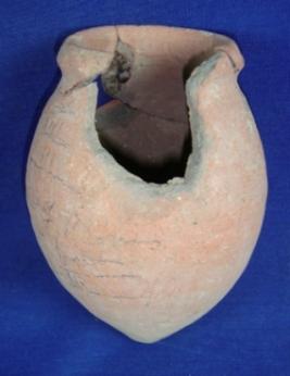 | Description / विवरण | Plain, terracotta coarse vessel - a pot with broad mouth, inverted rim with concavity below, bulbous body and pointed base. It is ill fired with black core. The upper body is broken into several pieces but retouched. Part of the body with rim is missing. |
