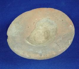 | Description / विवरण | Ill fired terracotta Lid having thick round body with slight depression on a footed stand base. It has clay incrustation on it and it is probably a stand or a lamp. |