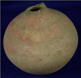 | Description / विवरण | Round terracotta pot, with oval base. The upper body has close striation marks, while the lower body is plain. The mouth and neck is broken. |