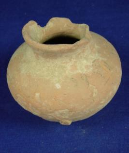 | Description / विवरण | Terracotta pot, with round and flat base, round body, with averted rim but some part of rim is broken. Clay incrustation over all the body |