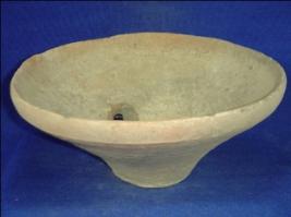 | Description / विवरण | Terracotta bowl with a broad mouth, thick rim and a narrow flat base without any decoration. There is a crack and a hole due to breakage. It was probably used as a utensil. |