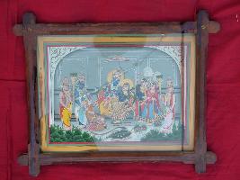 | Description / विवरण | This painting is named as Ram Panchayat in which Ram and Sita are shown in sitting posture on a throne, one leg of Ram is on the thigh of Hanuman. Besides these three male and two female attendants are shown. It is mounted in a frame. |