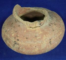 | Description / विवरण | Ill fired, fine terracotta pot, The base is flat and round. The body is round having striation marks on the waist portion and, almost all the part of the rim is absent. |