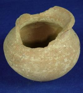 | Description / विवरण | Coarse, terracotta pot with flat and round base. The body is round, close striation marks on waist and neck. Almost all the rim part is broken. |