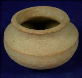 | Description / विवरण | Terracotta small pot in round shape with circular flat base, broad mouth and thick averted rim. The body is carinated in middle portion. It was either used as a utensil or for religious purpose. |