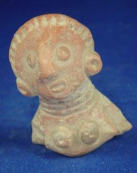 | Description / विवरण | Terracotta human figurine - bust of a female with all the facial features like eyes, nose, mouth and ears are prominent. She is adorned with earrings, necklace of incised lines and a beautiful head gear. The breast are appliqued by pellets. Body below chest is missing, hands are also broken. |