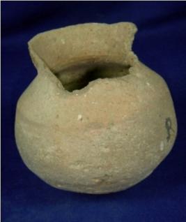 | Description / विवरण | Terracotta pot in round shape with striation around the body, narrow neck and high averted rim. Portion of rim is broken. It was either used as utensil or for religious purpose. |