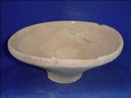 | Description / विवरण | Terracotta bowl with broad mouth thick rim and a narrow flat circular base. The inner part is smoother than the outer surface and wheel marks are prominent on the outer surface. It was probably used as an utensil. |