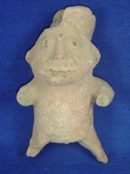 | Description / विवरण | Ill fired terracotta standing human figurine toy. The head has bun on top of the head with crescent shape coverage on it, incised eyes, ears and mouth, incised moustache around nose. The body has hands, stretched forward and out stretched conical legs. There is a hole at the bottom. There is something inside to marks tinkled noise. |