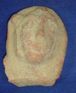 | Description / विवरण | Terracotta human head in high relief on an arch shaped base. It has long face, curved lines on fore head, knob at right side, large eyes, sharp nose and small lips. |