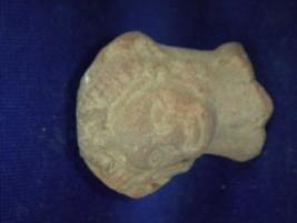 | Description / विवरण | Head of a terracotta human figurine, probably female. Headgear pointed at both sides , right ear, round face and thick neck is visible. The features are slightly rubbed out. |