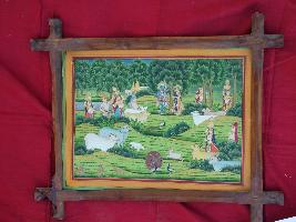| Description / विवरण | This is a painting of Radha and Krishna along with friends. Besides Radha and Krishna cows, peacocks, monkies, one temple has been shown. In the background sky can be seen. Krishna and Radha have been shown ornamented |