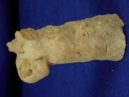 | Description / विवरण | Terracotta human shaped dice, having a long cylindrical body and circular base. The right hand is folded with a hole across it. The head and left arm are broken. |