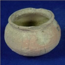 | Description / विवरण | Small plain, terracotta vessel - pot, with broad mouth and round body. It has cut mark at one side, below the neck. |