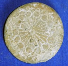 | Description / विवरण | Terracotta disc, circular in shape, with flat ends. At one end long floral petals are seen, the part is partially flaked off, while on the obverse side 14 circles are seen, touched by some incised lines, coming out from a small incised circle at the centre. This side is also slightly flaked off. The body is also designed with incised blocks, with cross marks inside it. |