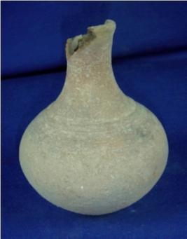 | Description / विवरण | Terracotta vessel - pot, with long, slender neck and round body. The base of the neck has closed striation marks. The mouth is partly broken. It is a coarse pottery, with black core. |
