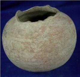 | Description / विवरण | Plain, round, terracotta Pot, with a broad mouth and circular base. The neck is broken, there is a hole in the lower body and two holes at the base. The wheel marks are visible. |