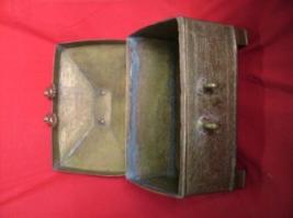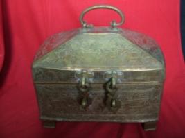 | Description / विवरण | A brass box. It has two locks and one handle. The box is engraved with different designs, surrounded by floral pattern and animal figures. |