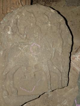 | Description / विवरण | This memorial stone is having a horse riding scene. The horse is designed with carved, curved lines. The rider is holding a lotus with one hand and a sword in another hand. Upper portion is in semicircular shape and lower portion is having carved floral designs.below the sculpture inscribed devanageri script. |