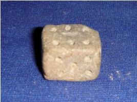 | Description / विवरण | Terracotta dice, rectangular in shape, probably used for playing. It has small incised holes in each side from 1 to 6. |