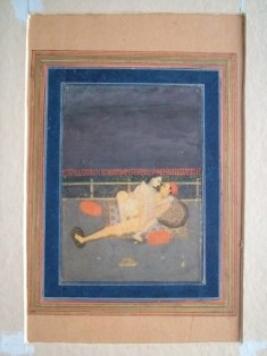 | Description / विवरण | A man is standing on a ground, a lady is sitting on a wooden chair, one leg of lady is on the shoulder of the man. Colour used are red, blue, pink. He is holding penis in his left hand. |