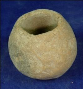 | Description / विवरण | Small plain, terracotta bowl, with narrow mouth and thick, round body. It has two perforated holes at one side and probably there was a spout, which is missing. It is crudely finished. |