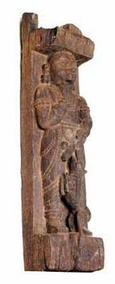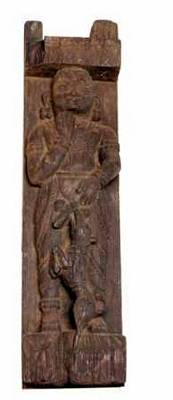 | Description / विवरण | An erotic wooden sculpture of temple charriot. A standing man with combed hair drawn backwards and tied with back knot. He wears lower garment tied with waist band, anklets, armlets, wristlets, kundalas. He is shown exposing his genitals with his left hand and offering to the dog, which is standing on its hind legs and chewing, keeping its forelegs on the thigh portion of the man. |