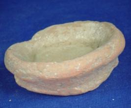 | Description / विवरण | Ill fired, coarse, terracotta lamp with round and flat base, flayered body, featureless rim which is partially broken, circular incised lines are seen at the bottom. |