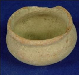 | Description / विवरण | Coarse terracotta vessel - pot having a flat circular base, bulbous body, low neck and a wide mouth. The rim is thick and averted but broken. |