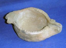 | Description / विवरण | Terracotta lamp, with flat base and designed with incised dots projected rim to put the flick. The lamp has a deep depression and a handle to hold it. |