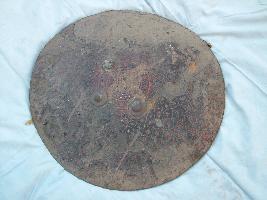| Description / विवरण | It is a shield made by Rhinoceros skin, it has a plain border within concave and circular shape. It has provision for holding iron bolt & leather . In the front side it has 4 knobs decorated internally it is painted in black colour and externally it has got floral and cripple motif decoration in brown on black colour. |