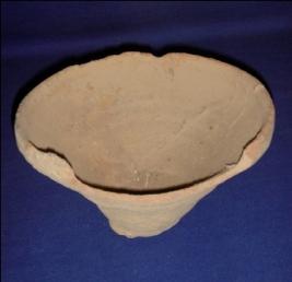 | Description / विवरण | Coarse, terracotta bowl with a flat, circular and narrow base, a flayed body with thick and inverted rim. It is partially broken. |