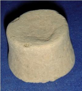 | Description / विवरण | Cylindrical terracotta disc, with one flat surface and another surface with depression, the edges are concave, clay incrustation all over. |