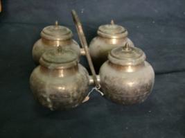 | Description / विवरण | Four globular vessels with covers attached to each other with brass rod. Engraved designs. |