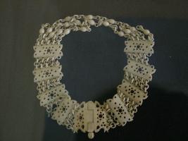 | Description / विवरण | It is an ivory necklace. It is decorated with incised plates and beads and chains. They are joined together in systematic order. It is provided with a clamp and a shaft for wearing purpose. |