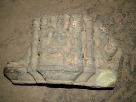 | Description / विवरण | This Fragment of of makar toran represents an image of a god with three heads. This four handed image is in seated posture. It is carved within a niche having well finished pillars like decoration. It is also decorated by engraved design. |