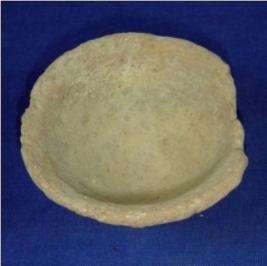 | Description / विवरण | Coarse terracotta Bowl with a slightly inverted rim and a flat circular footed base. A part of the rim is broken and the pot is crudely finished. |