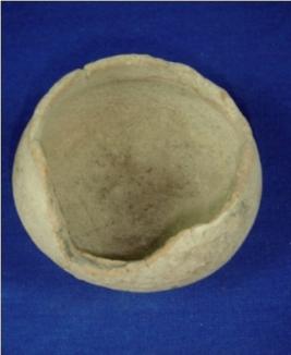 | Description / विवरण | Terracotta, coarse pot, with featureless rim, stout, bulbous body and pointed base. The core is black and it is broken from the rim to the middle of the body at one side. |